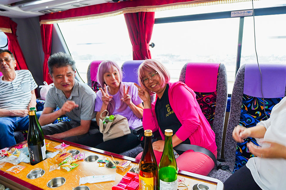 メンバーは、東京都小売酒販組合や浅草酒販協同組合に加盟する酒販店や、酒類関係者。酒屋さんの常連さんの姿もあり、大変賑やかな集まりでした。また、添乗員として本業でバスガイドの経験もあるさいとう千晶さん(プロフィール)も加わり、バス車内は大いに盛り上がりました。
