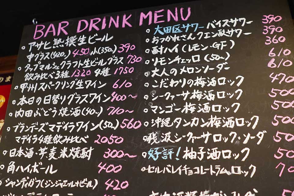角打ちで飲めるお酒は、さすが専門店といえる個性豊かな顔ぶれです。マニアックなポイントですが、大田区大森にあるコダマ飲料がつくる割材「バイス」を「大田区サワー」として載せているのはおもしろいです。